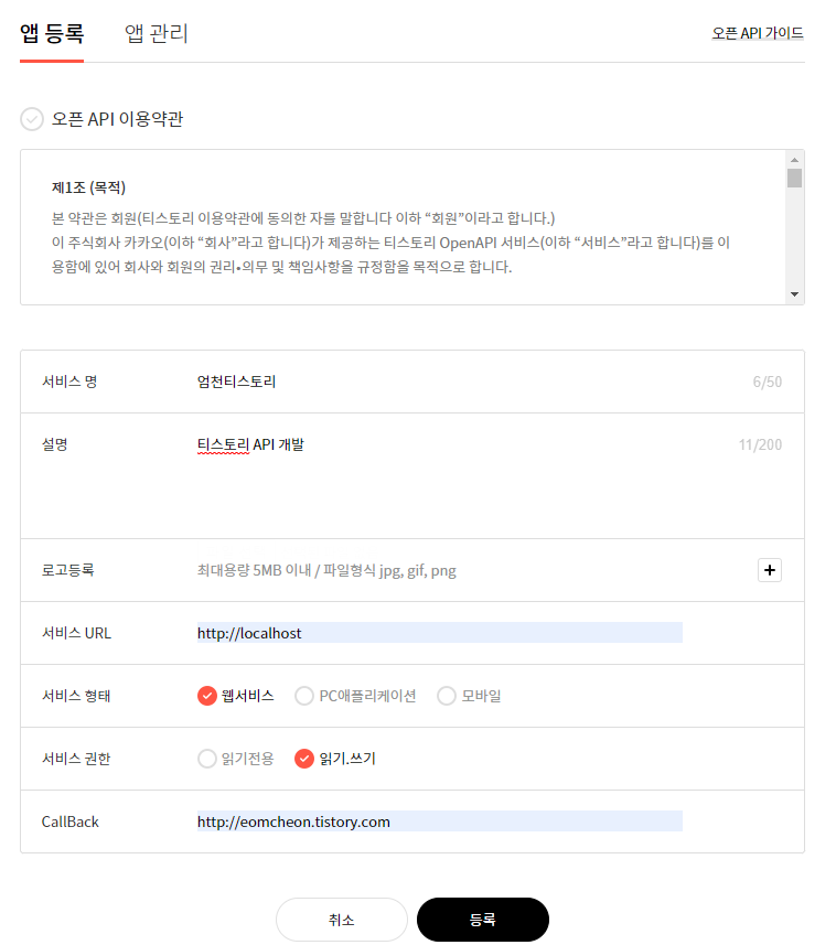 일단 티스토리 API를 사용하려면 키 발급을 위해 앱을 등록해주어야 한다.