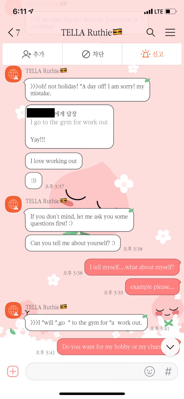 우선 처음에는 간단히 이런저런 이야기를 나누게 되고, 중간중간마다 튜터가 틀린 내용에 대한 첨삭을 해준다.