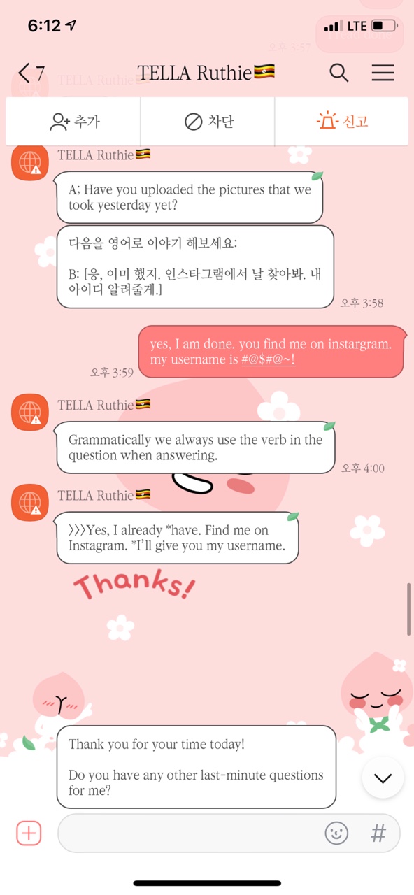 우선 처음에는 간단히 이런저런 이야기를 나누게 되고, 중간중간마다 튜터가 틀린 내용에 대한 첨삭을 해준다.
