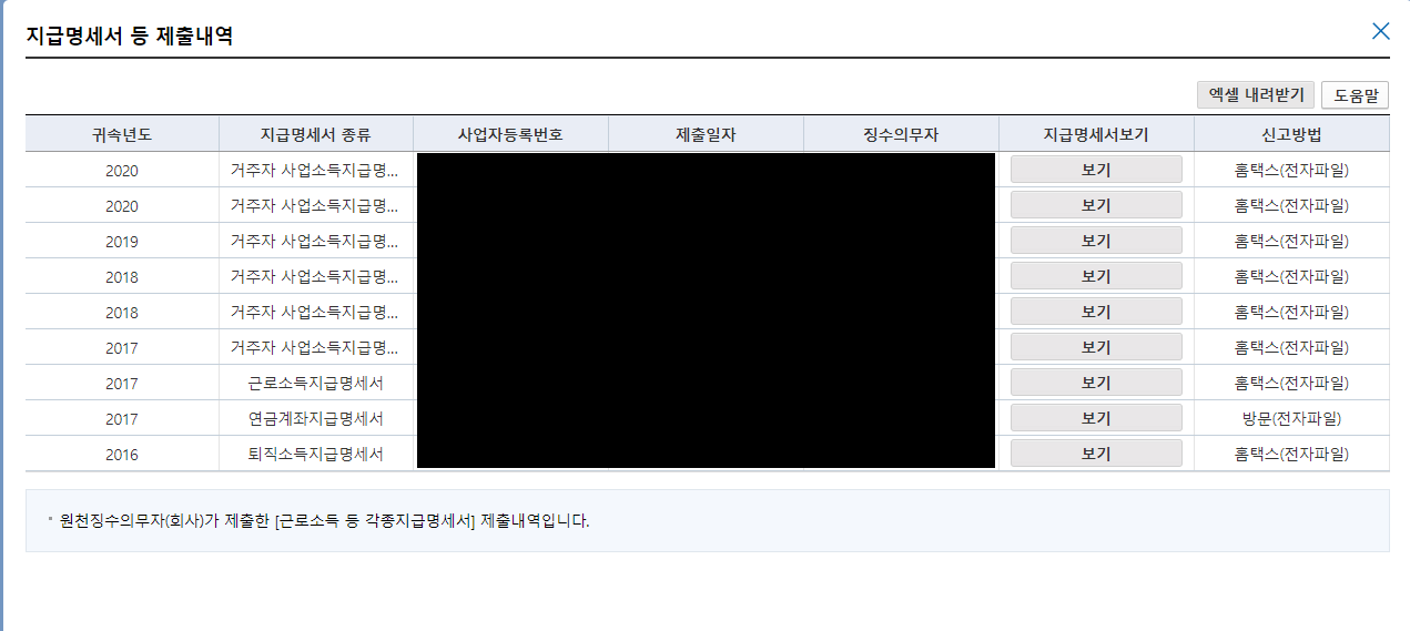 마이홈택스 -> 연말정산/지급명세서 -> 지급명세서 등 제출내역 클릭