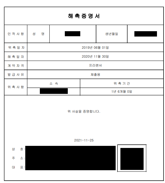 즉, 해촉증명서는 퇴사 증명서와 동일하다고 보면 됨