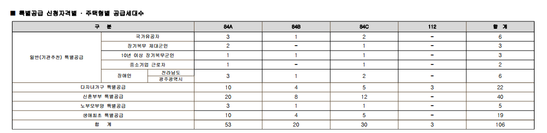 역시나 예상했던대로 112제곱미터는 특별공급에서 다자녀가구에만 단 3가구만 공급된다.