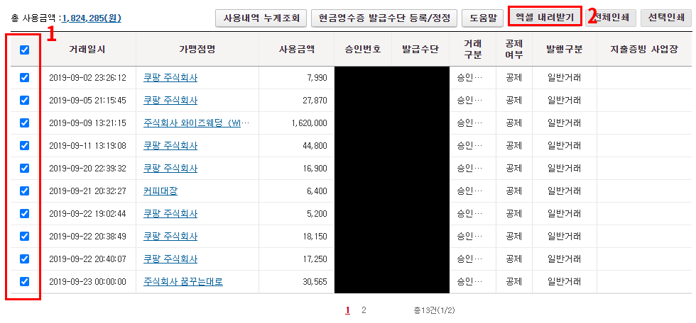 위의 리스트에서 엑셀다운로드/인쇄를 원하는 항목을 체크선택한 후 원하는 버튼을 클릭하면 된다.