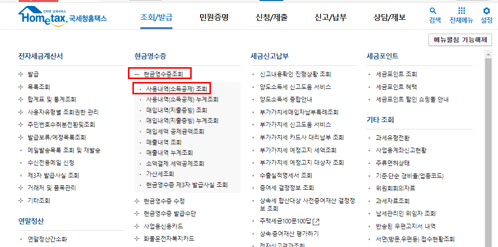 이럴때 내가 발급 요청했던 현금영수증 정보를 홈택스에서 간편하게 조회가 가능하다.