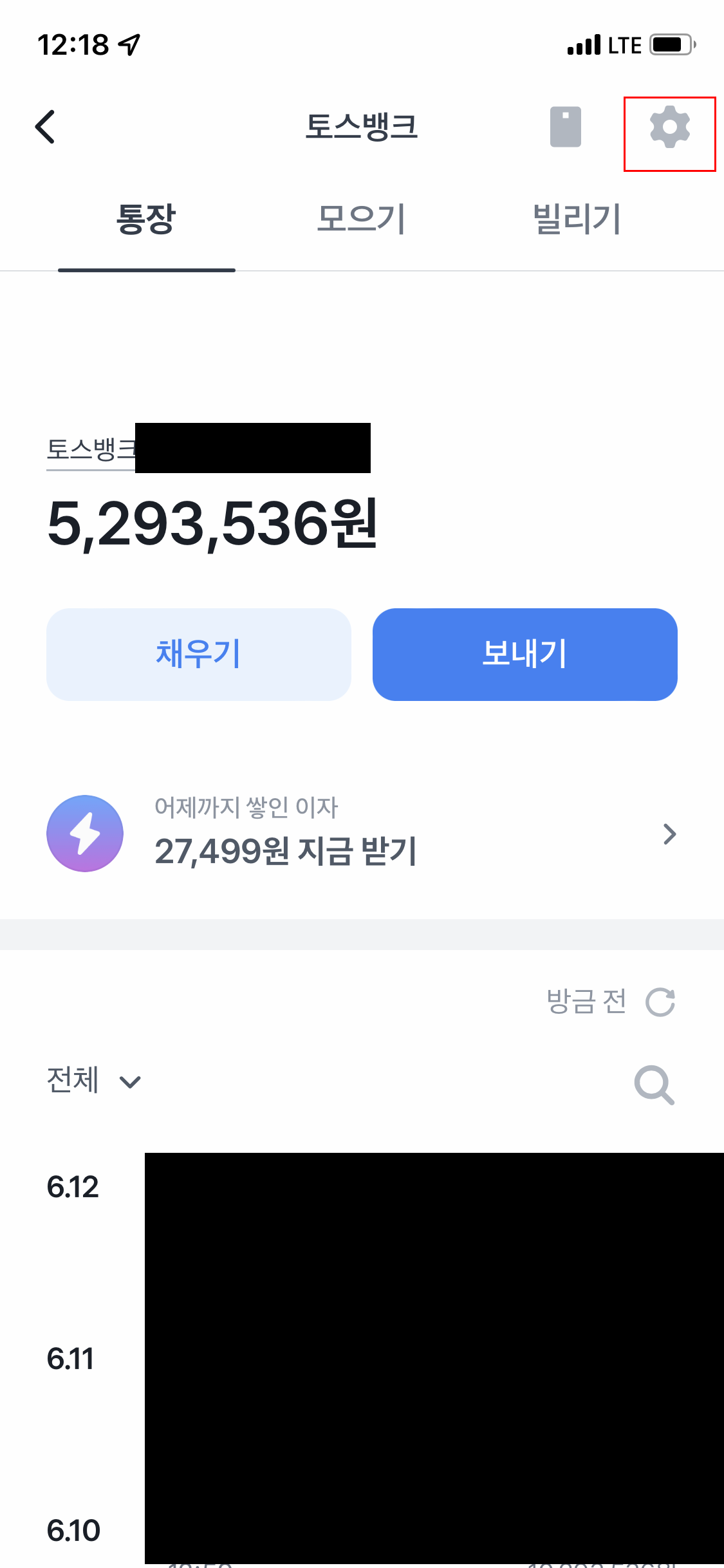 토스뱅크 로그인 후 계좌를 선택한다. 우측상단의 톱니바퀴모양을 선택한다.