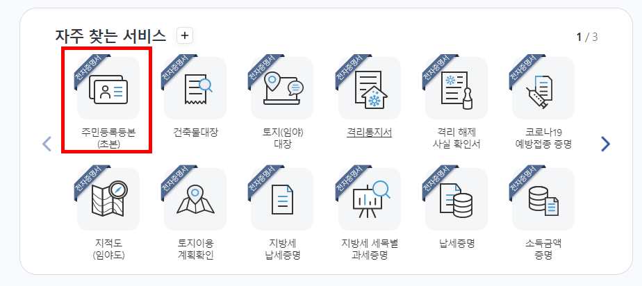메인페이지에 위와같이 주민등록등본(초본)으로 선택할 수 있는 버튼이 있다. 만약 위 버튼을 찾기가 어려우면 검색창에 검색해도 된다. 검색어는 등본으로 해두면 될것같다.