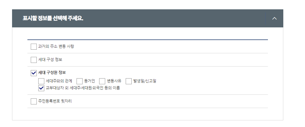 세대주와의 관계(배우자, 자녀 등의 정보)도 노출하고싶다면 체크해주면 된다.