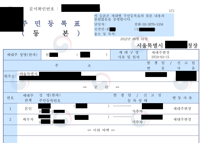 위와같이 노출된다. 나는 선택발급을 누른 뒤 모든 체크박스를 선택하지 않아서 세대구성원(남편)의 이름, 한문명 변동사유 등 아무 정보도 노출되지 않았다.
