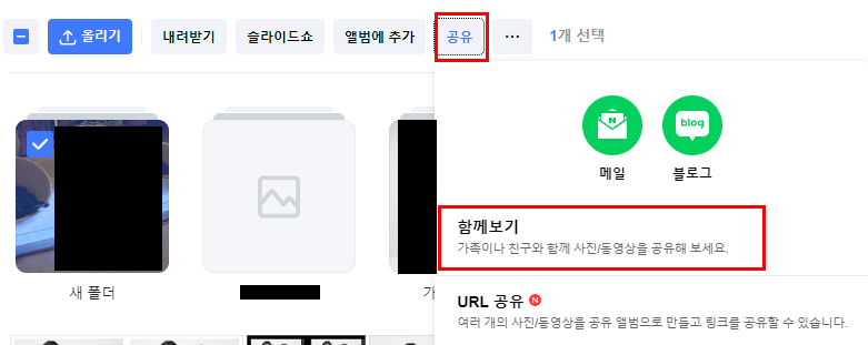 사진이 올려진 폴더를 체크박스 선택 후 공유버튼을 클릭한다. 공유 메뉴에 함께보기 버튼 클릭!