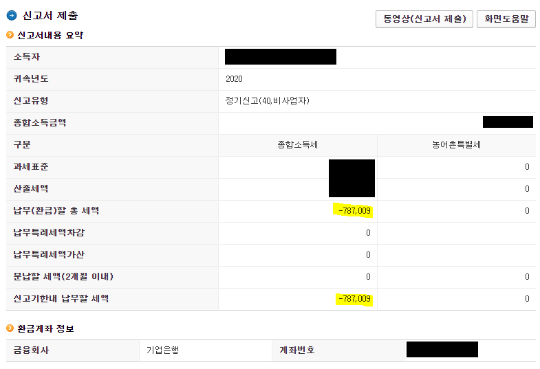 환급받을 계좌번호를 입력하고 제출하기 버튼을 클릭하면 최종 제출할 신고서를 확인할 수 있다.
