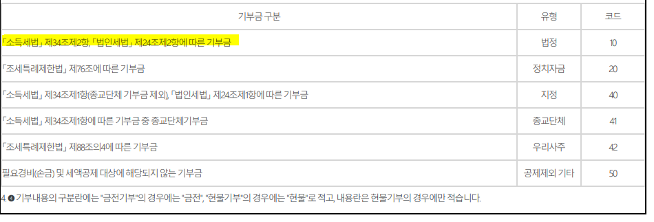 이때 설정해야 할 항목들이 많은데, 일단 내가 기부한 사이트의 기부금 영수증을 출력하면, 하단에 기부금 종류가 표기되어있다.